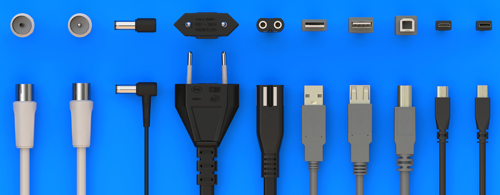 USB-Mini, USB-Micro, USB-Type B, USB 2.0, USB Extension, Antenna plug female, Antenna plug male, Euro plug, Small device plug, DC plug